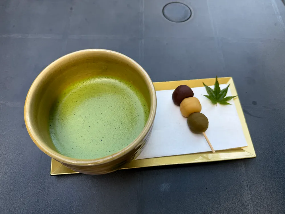 주문한 다과는 말차와 당고 세트입니다. 800엔? 정도로 좀 비싸 보이지만 대나무 숲 옆에서 먹는 고즈넉한 감성 값이라고 생각하니 납득이 됩니다.